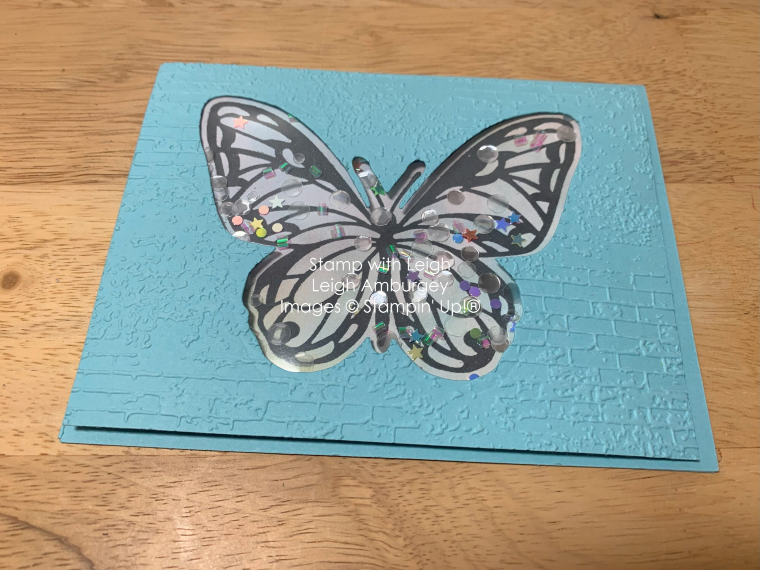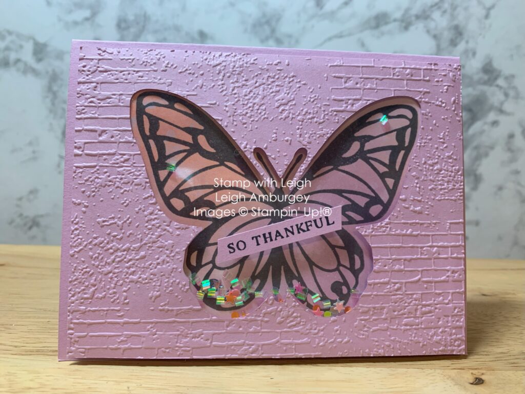 I stamped the large butterfly from the Beautiful Butterflies stamp set on to a piece of Bokeh Designer Series Paper and slipped it into a flip flap and added some loose shaker elements . I die cut the butterfly from a piece of Fresh Freesia cardstock and embossed with the exposed brick embossing folder and attached using foam adhesive strips. Stamped my greeting and ta-da, a really cute and easy shaker card.