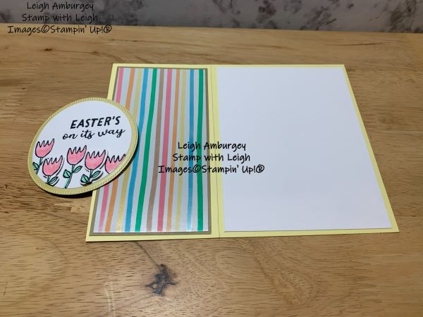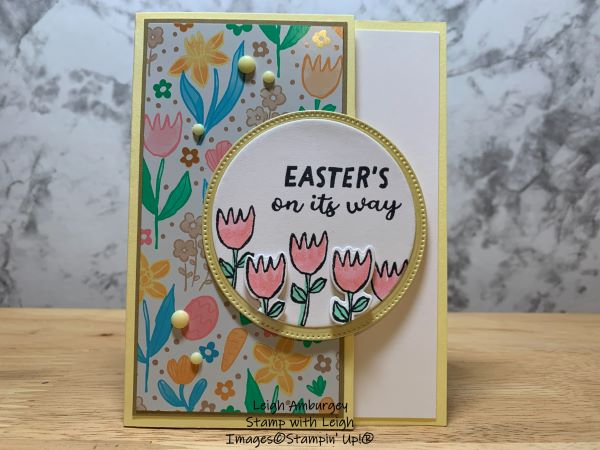 My card base is Lemon Lolly and “jazzed-up” with Easter Joy Specialty Designer Series Paper matted with Crumb Cake Two Tone cardstock. This glossy paper features playful bunnies, Easter eggs and blooming flowers with a hint of metallic foil shine. It brings all the charms of spring to your cards and paper crafting projects.