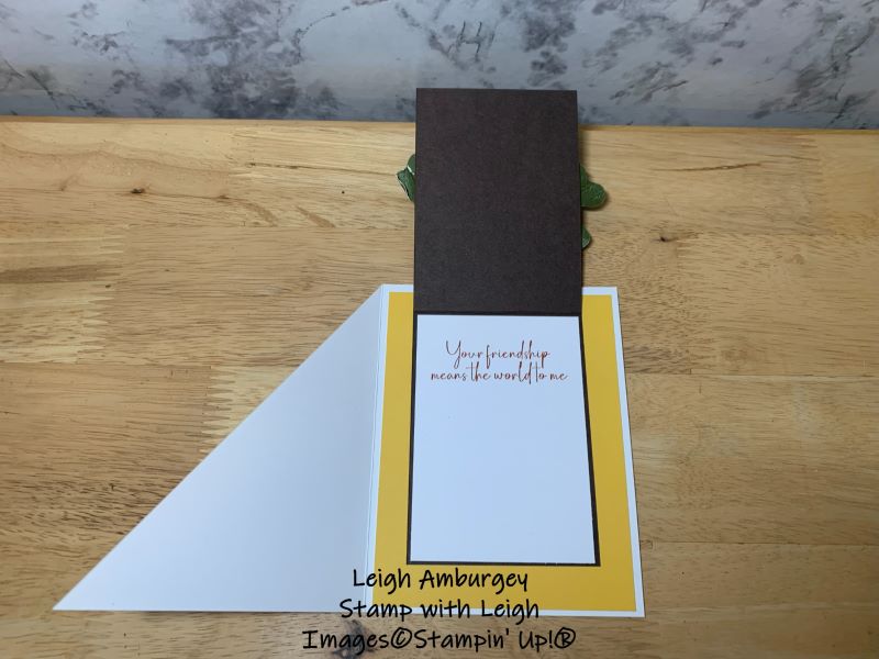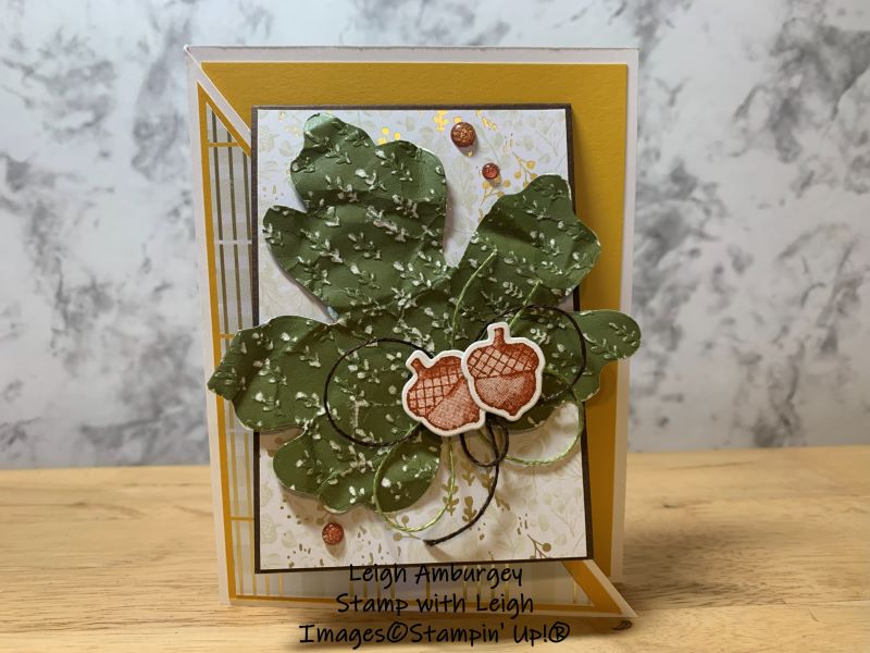 I used the Gathering Moments Bundle, an Online Exclusive from the Gathering Together Suite, for this Fall/Thanksgiving card. I used Mossy Meadow Two-Tone Cardstock for the leaf. After die-cutting the leaf, I embossed with the Gathering Leaves Embossing folder, then added additional texture by sanding and crumping the cardstock. Here’s a look at the fold and the inside of the card-