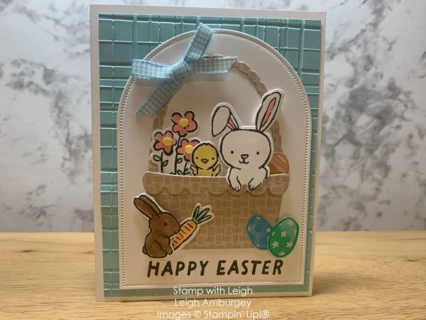 My Easter Basket was die cut using Easter Joy Specialty Designer Series Paper and attached to a Everyday Arches die cut. I used Lemon Lolly, Timid Tiger, Shy Shamrock, Pretty in Pink and Pecan Pie Stampin’ Blends to color the bunny, carrot, flowers, chick and bunny. I added some Easter Assortment dots to the center of the flowers. I added some fussy-cut Easter eggs and finished with a Balmy Blue Gingham ribbon.