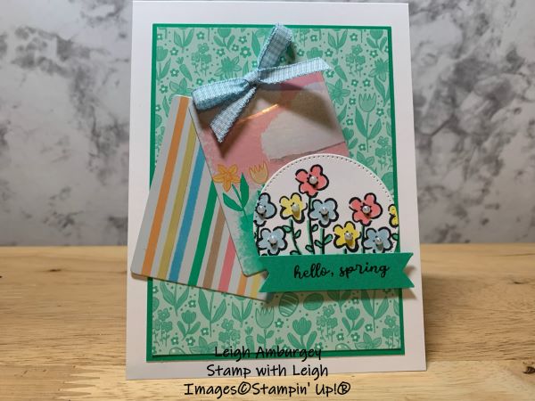 I pretty much stayed true to the sketch layout for my card. I used the beautiful Easter Joy Specialty Designer Series Paper since it features Balmy Blue, Pretty in Pink and Shy Shamrock, My two panels were popped out using the Creative Haven dies. I added a Balmy Blue gingham ribbon to cover the tag cutout on this die. I did some repeat stamping with the flowers from the Easter Basket stamp set, colored with Stampin’ Blends alcohol makers and cut with a Stylish Shapes die. The greeting was stamped with Memento Tuxedo Black ink and the perfect size to use with the Three Banner punch. For added lift, I attached this with some mini dimensionals. Some Iridescent Peals to completed my card.