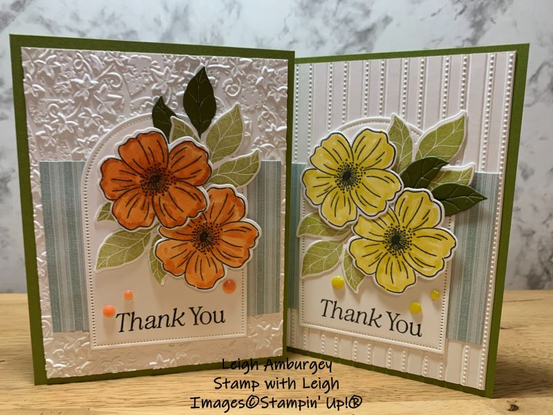 Here’s the same layout, but with different embossing folders and colors. The Gathering Leaves embossing folder featured with the Petal Pink flowers is on the Last Chance List at a discount.