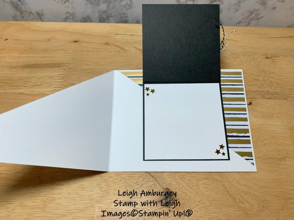 To keep with the gold in this designer series paper, I stamped my greeting, from the Traditional Labels stamp set, with Versa Mark ink, added gold embossing powder and heat set. After letting this cool, I popped it out with the Traditional Labels dies. I also embossed the jingle bell from the Party Celebrations stamp set and did a little fussy cutting with my paper snips. I added a double bow using Black & White & Gold Baker’s Twine and some Gold Shaker Stars for added shine.