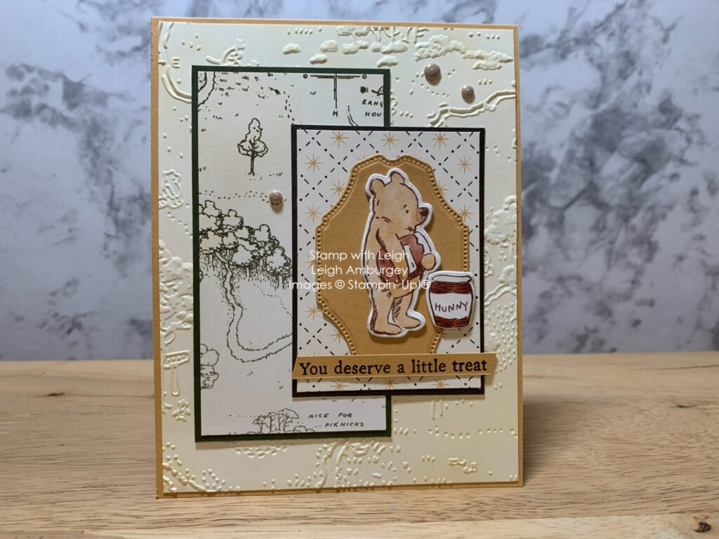 I used products from the upcoming Silly Old Bear Suite Collection to make this adorable card. This suite lets you create whimsical scenes with childhood companions, honey and jam jars and woodland details. This suite is great for both cards and scrapbook pages. This collection is an Online Exclusive available May 5th.
